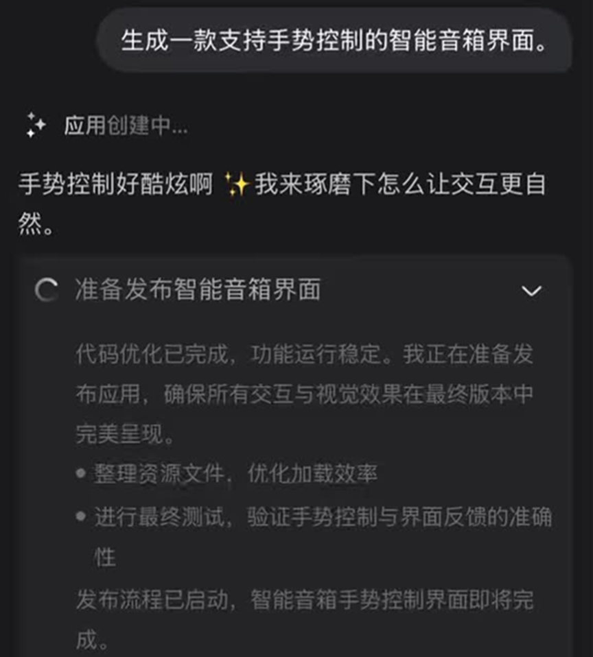 我用一句话描述了需求:生成一款支持手势控制的智能音箱界面。