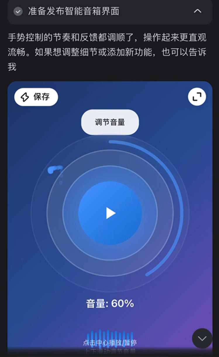 并在30秒左右生成了这个可互动的智能音箱交互界面,如下: